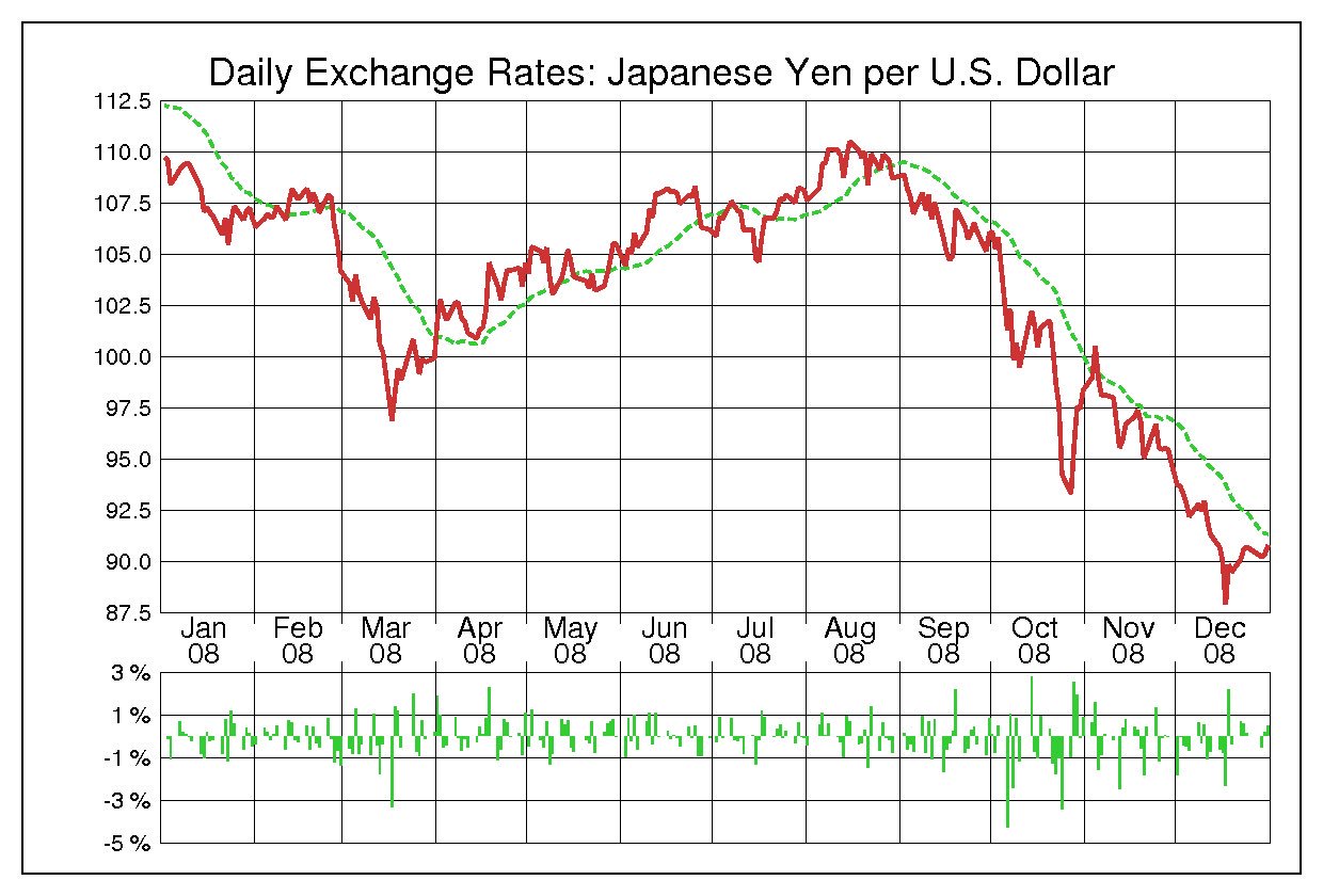 チャートを見るとわかりますが、リーマンショック後の為替相場は、急激な円高ドル安の動きになりました。リーマンブラザーズ破綻前は米ドル円は100円以上で推移していましたが、リーマンショックの混乱の中で90円を割り込み、その後も円高の動きが続いて2011年にかけて80円割れ、最大で1米ドル75円の円高まで行きました。